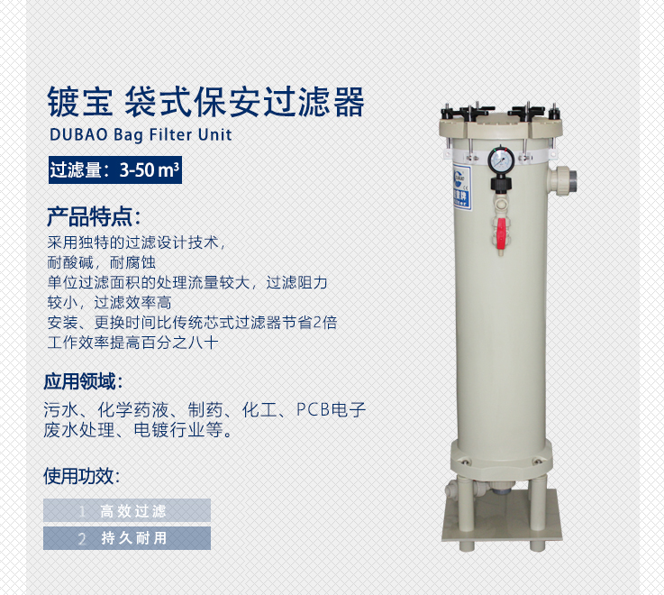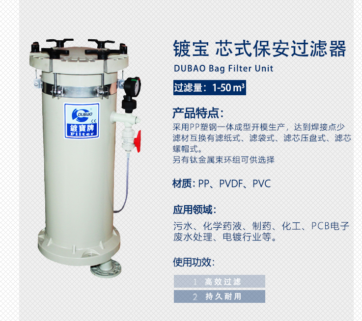 概述: 镀宝耐腐蚀塑料保安过滤器: 产品特点: 1、特别适用于电镀药夜、化学药液、纯水循环过滤等用途。 2、采用日本原装进口无轴封泵浦,绝无泄漏之虑。 3. 滤芯式设计,高精密过滤,过滤面