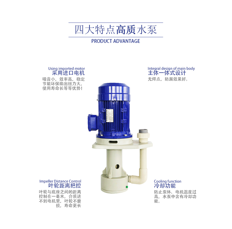 概述: 镀宝PP塑料立式液下泵 功能特点: 1.预体采用FRPP. PVDF等塑钢材料射出成型。 2.适台于槽内外使用。 3.低噪音,不泄漏,易于维护。 4.泵浦内使用干式轴封,空转不