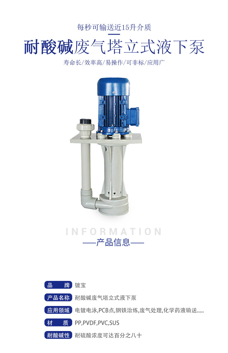 概述:功能特点:1、采用FRPP , PVD F各种塑钢材料射出成型可抵抗大部分的化学性,耐酸、耐碱。2、适合各种酸碱液循环,连续电镀,喷洗设备,废气塔使用。3、可空运转使用,不因空运转而损坏